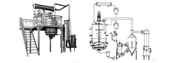 本設(shè)備主要由提取罐、外循環(huán)單效濃縮器及其他附屬設(shè)備組成,結(jié)構(gòu)緊湊,操作方便,集提取、濃縮、溶劑回收于一體。